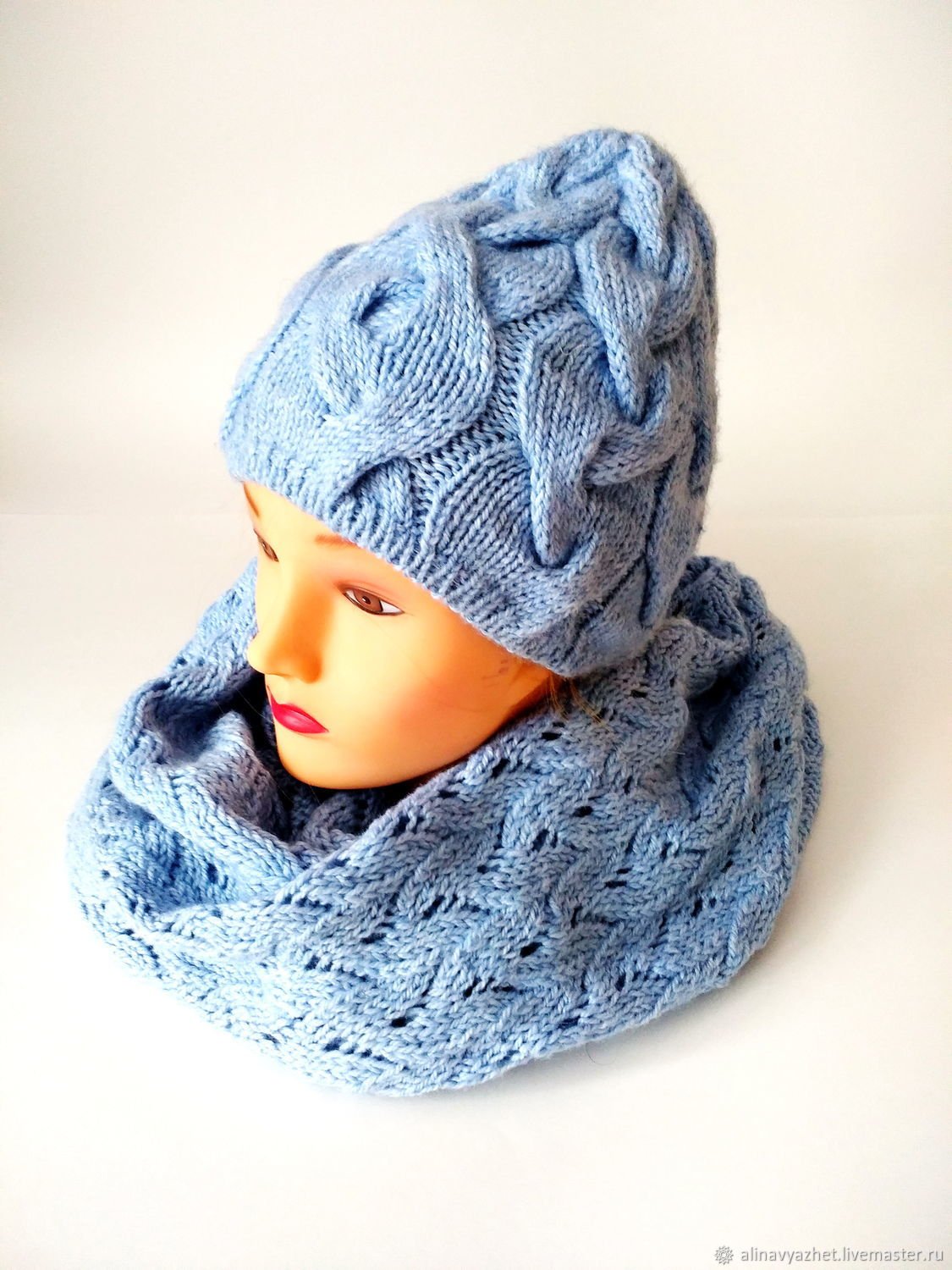 Голубой комплект шапка и снуд спицами