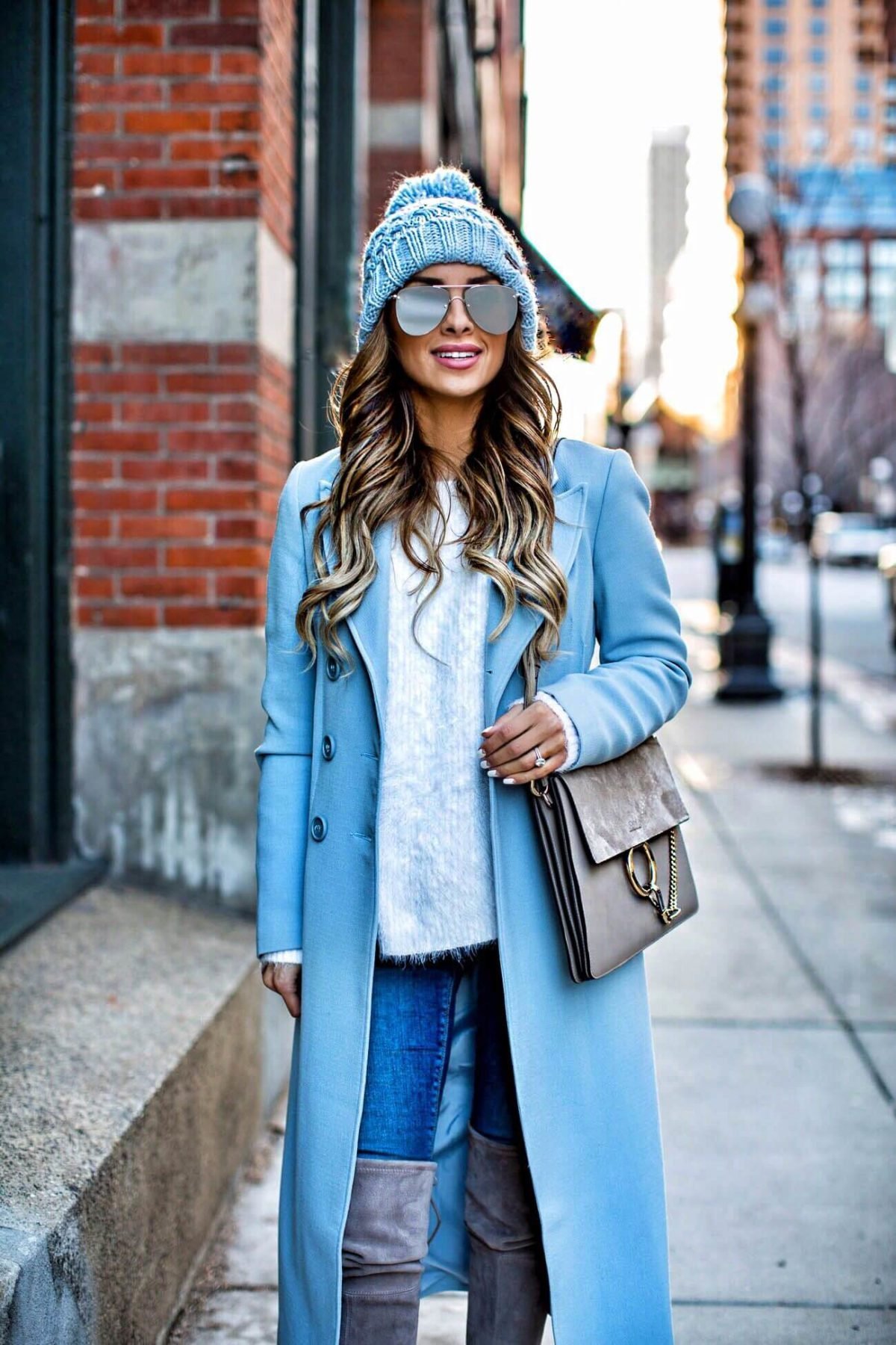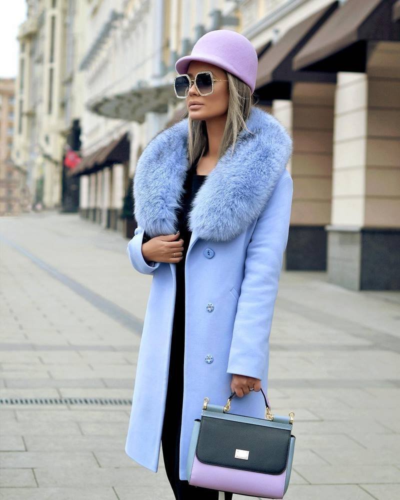 Образы с зимним голубым пальто