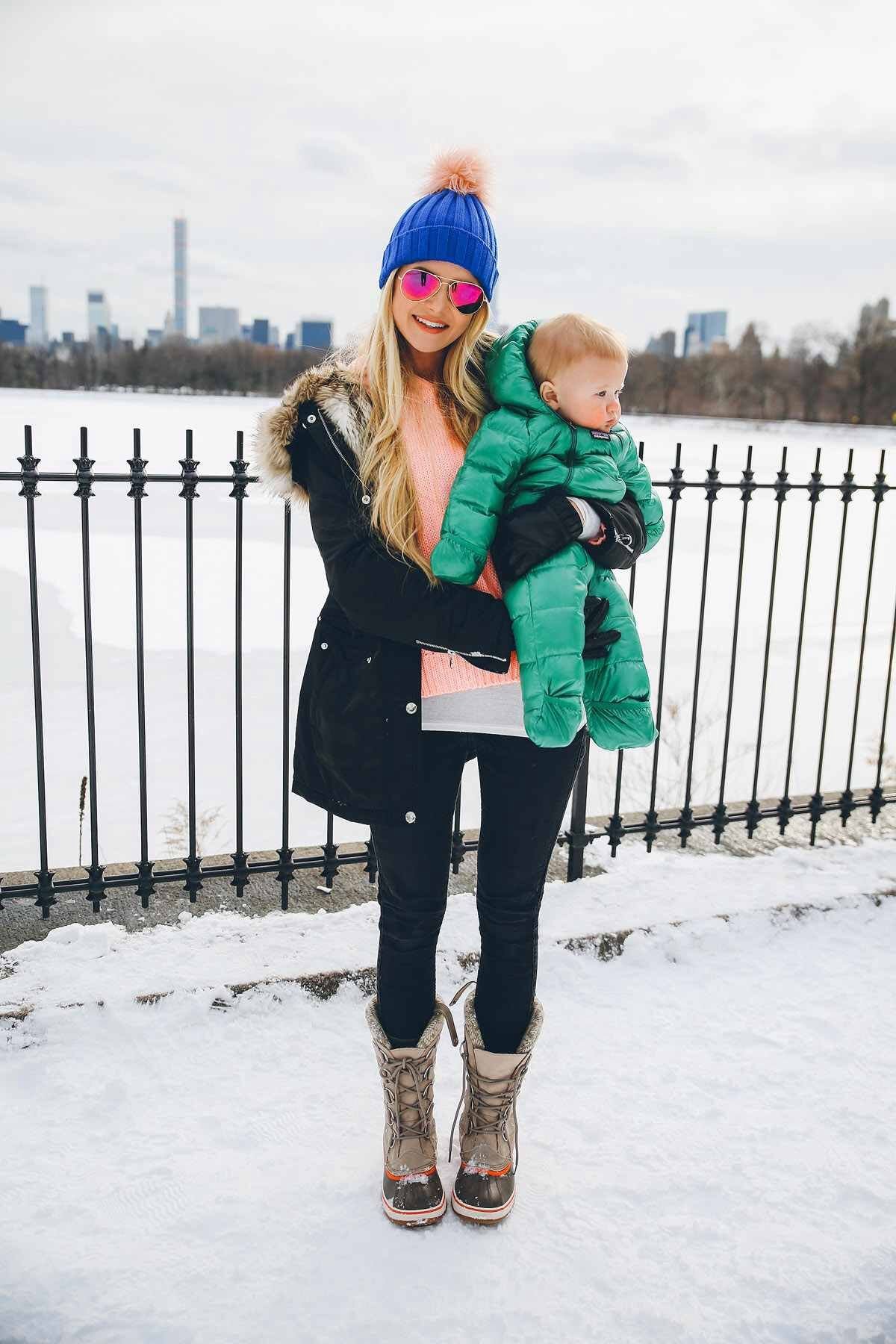 Синий пуховик с розовой шапкой
