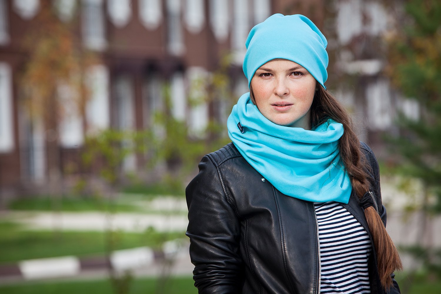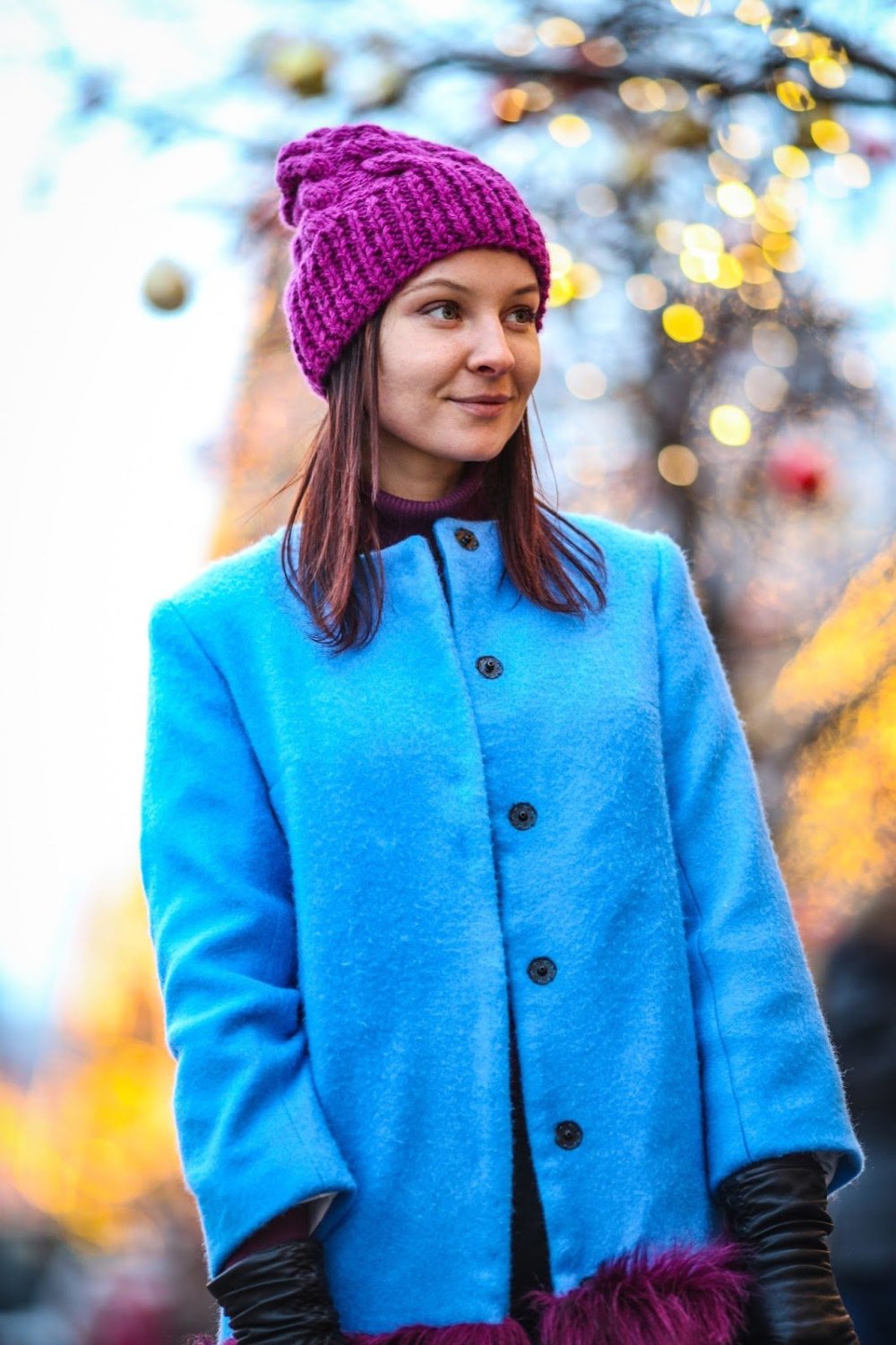 Бордовая куртка с голубой шапкой