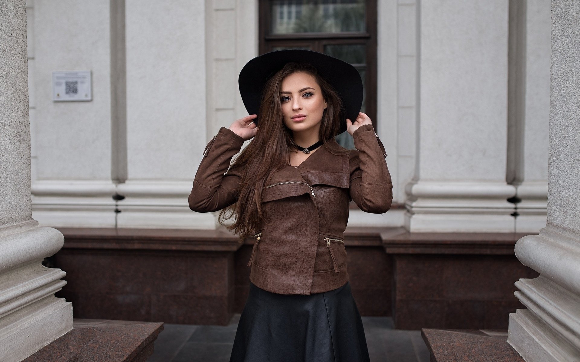 Девушка в кожаной куртке и шляпе
