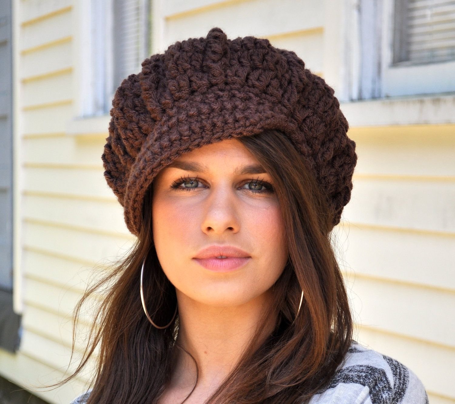 Объемная вязаная беретка с козырьком