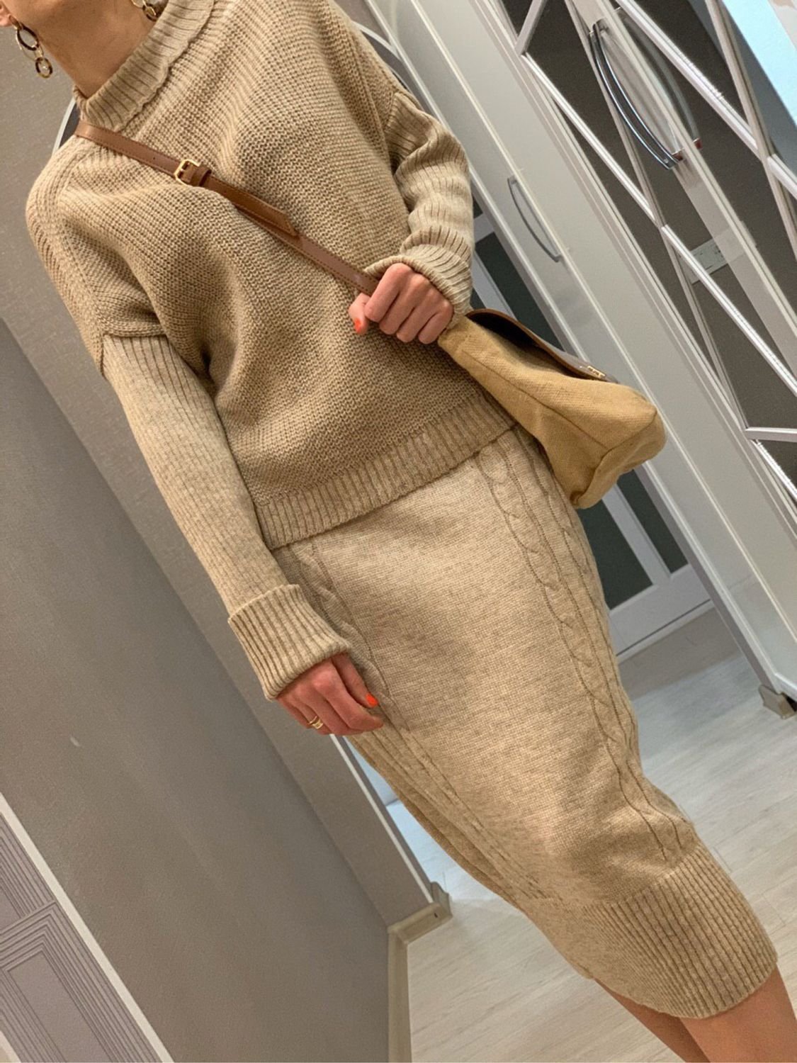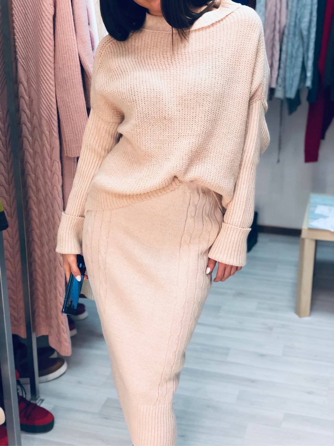 Бежевый вязаный костюм с юбкой