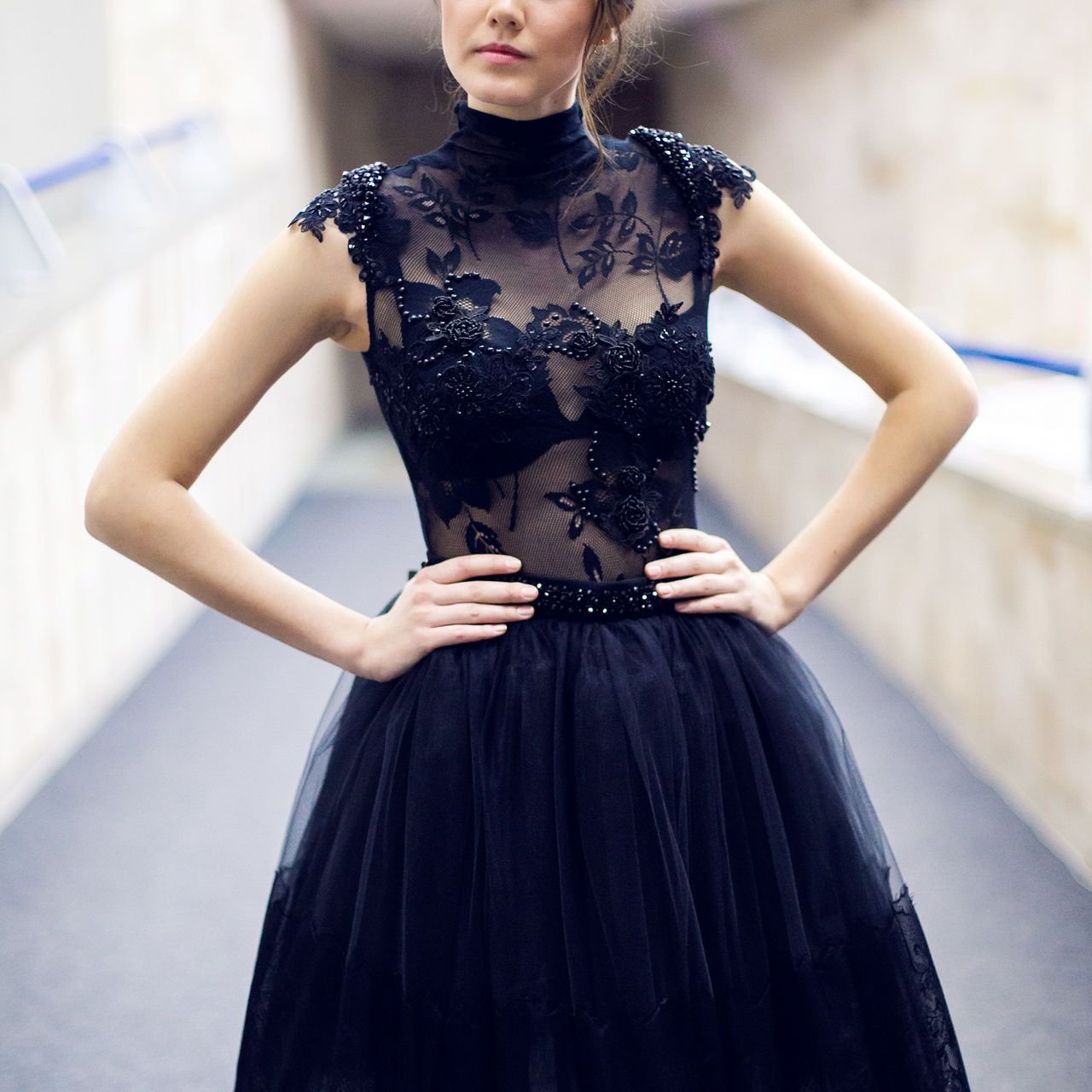 Прически к черному пышному платью