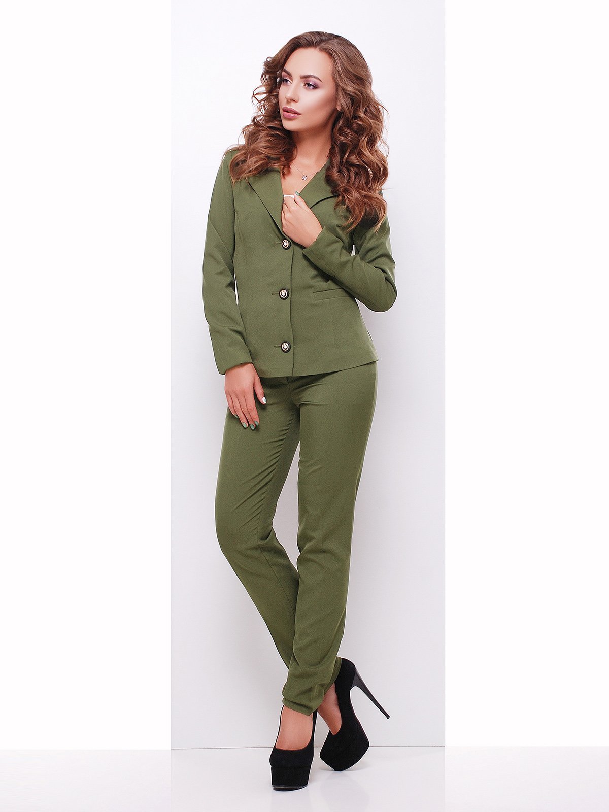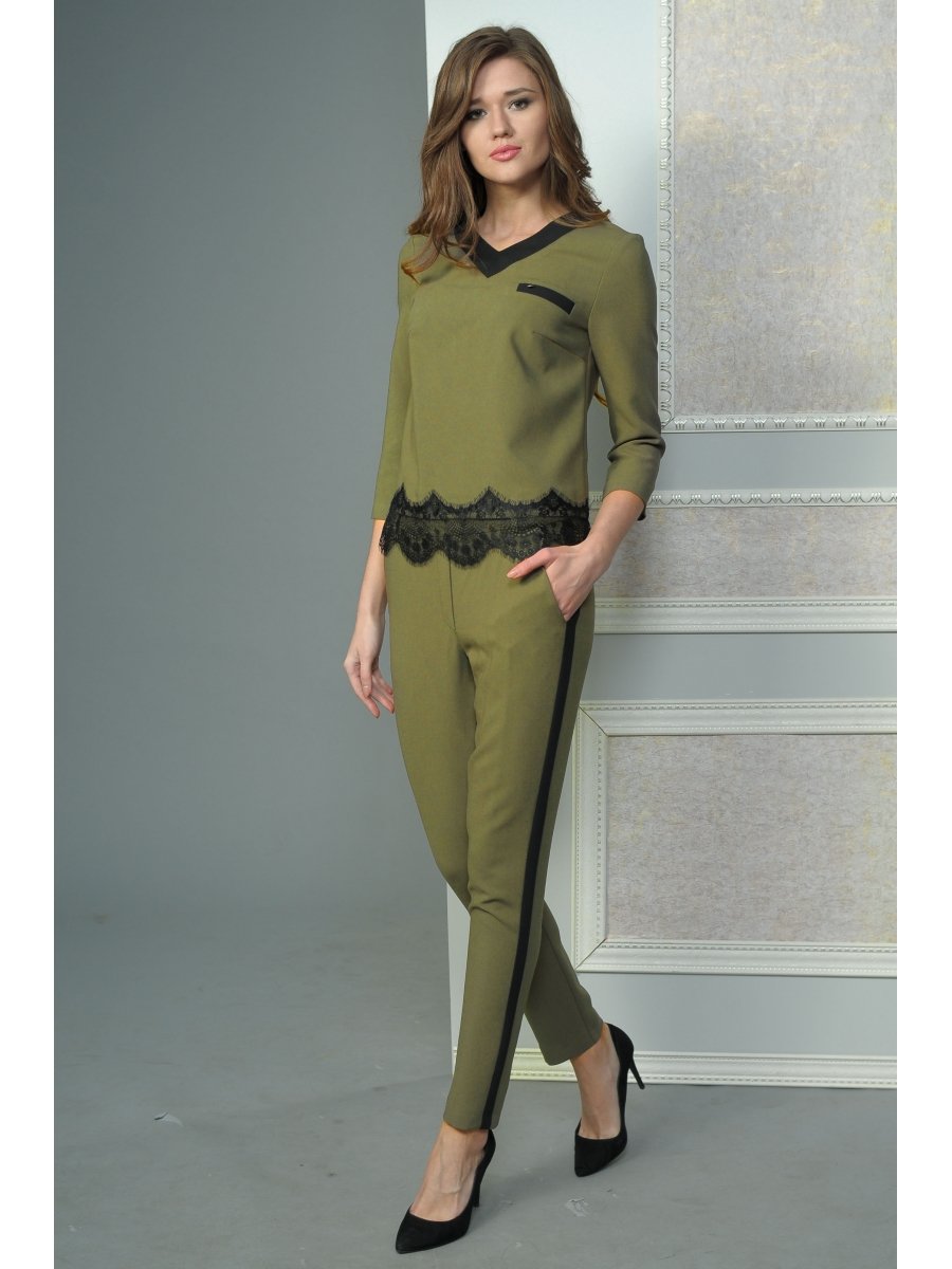 Оливковый брючный костюм женский