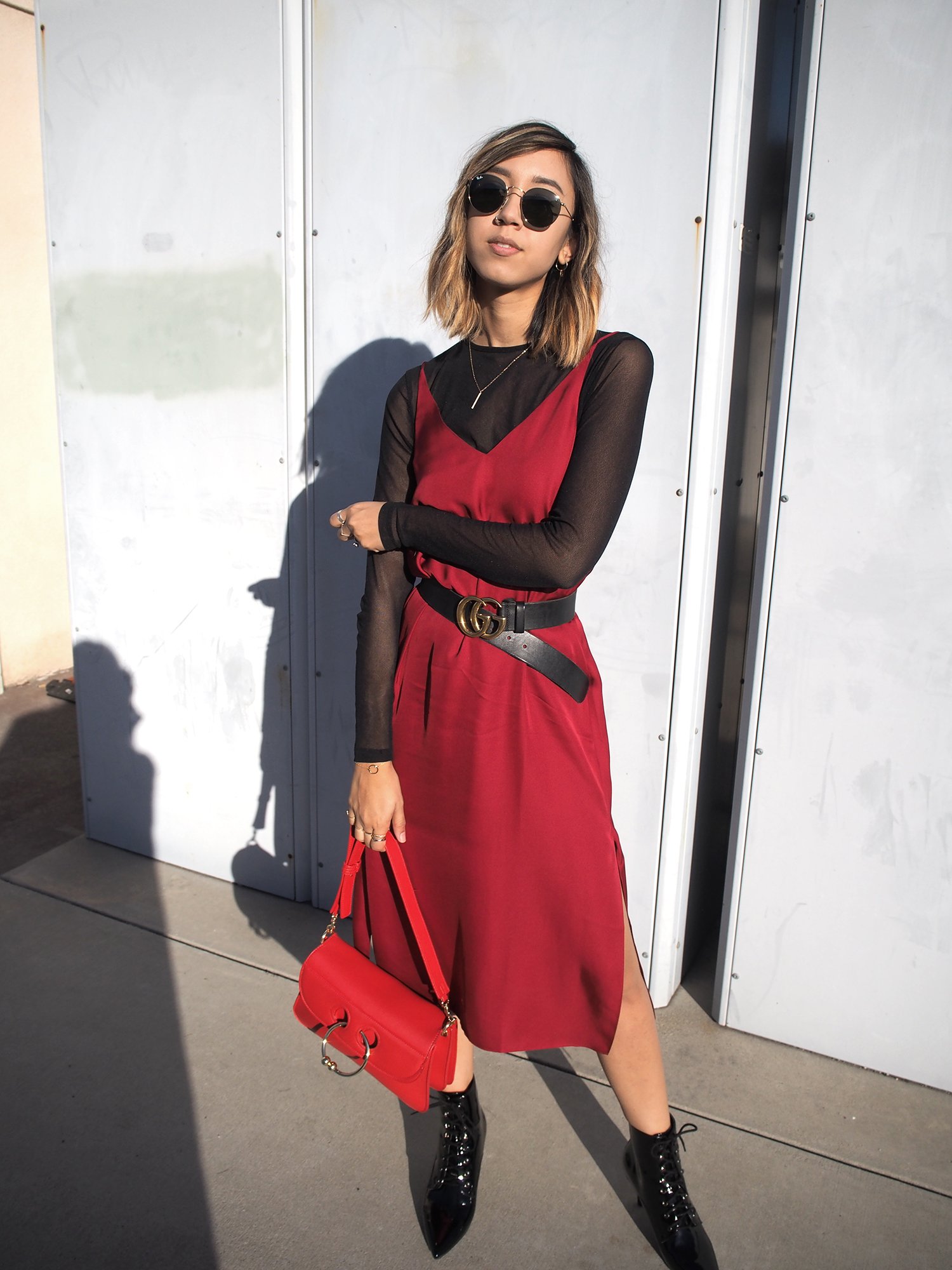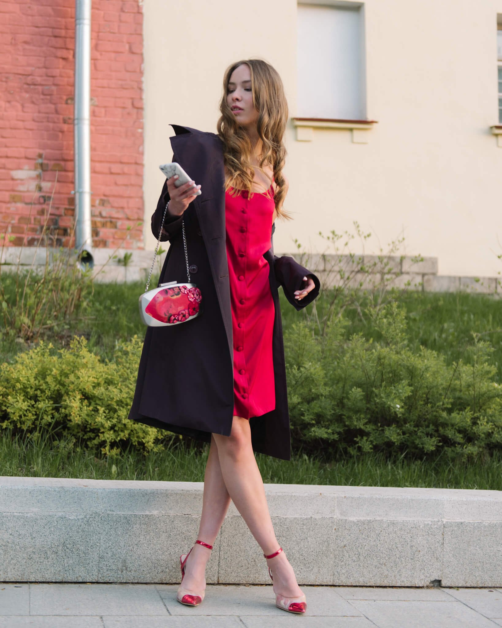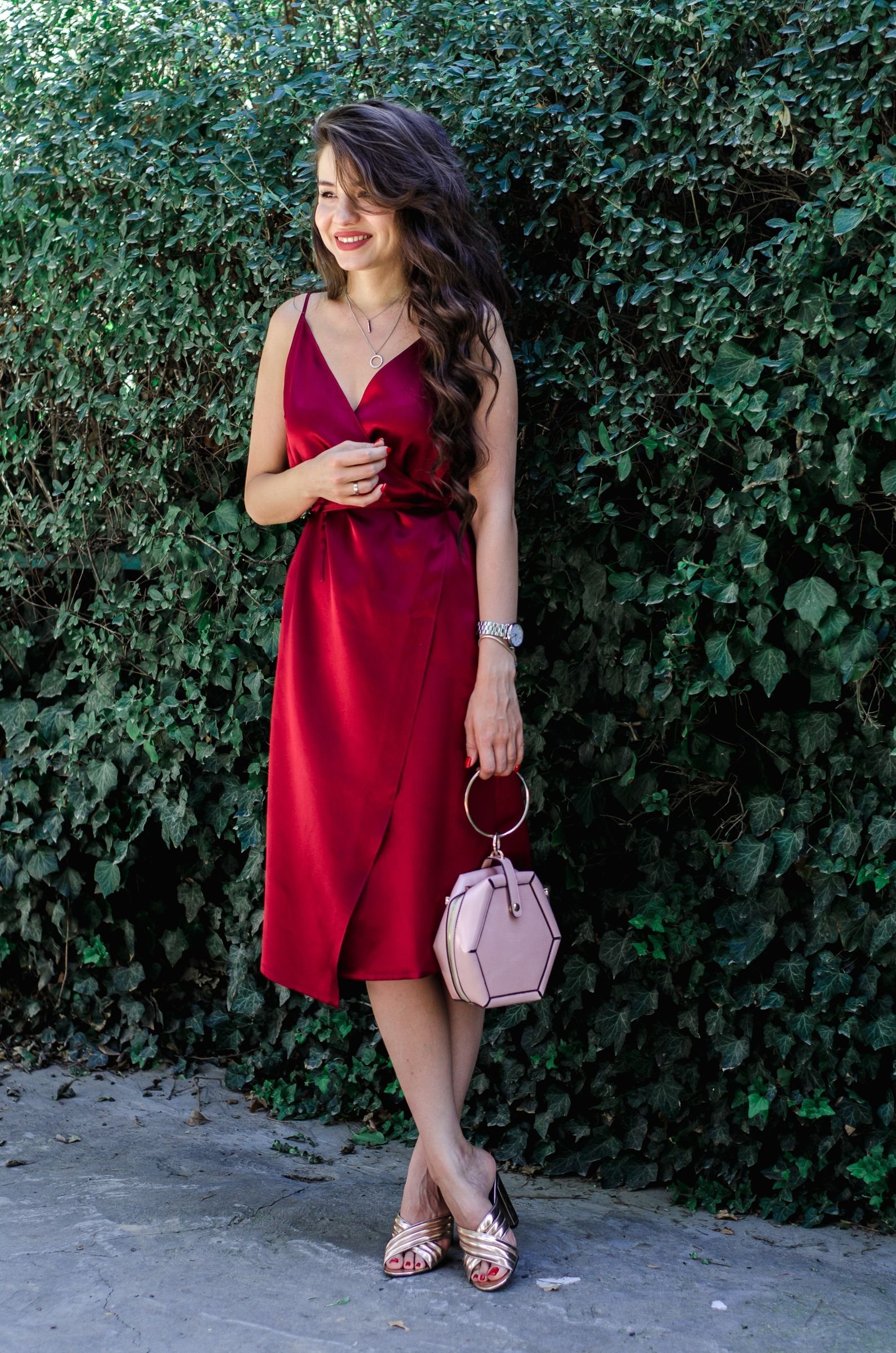 Образ с красным платьем в бельевом стиле