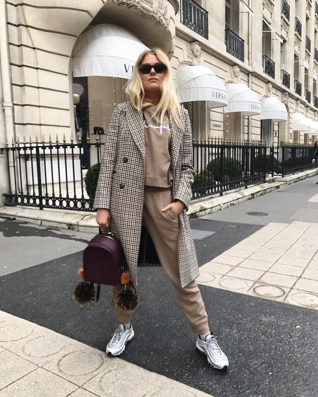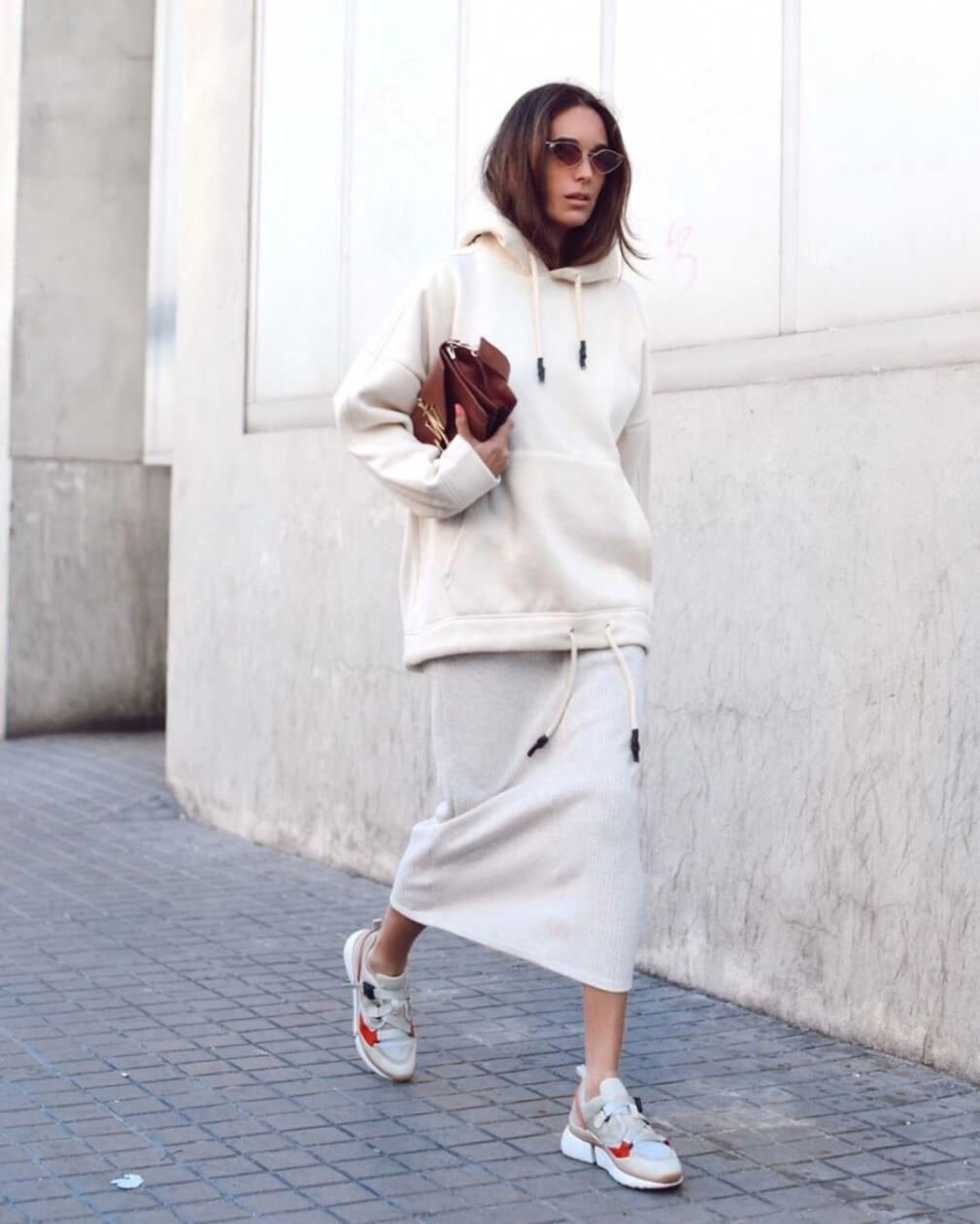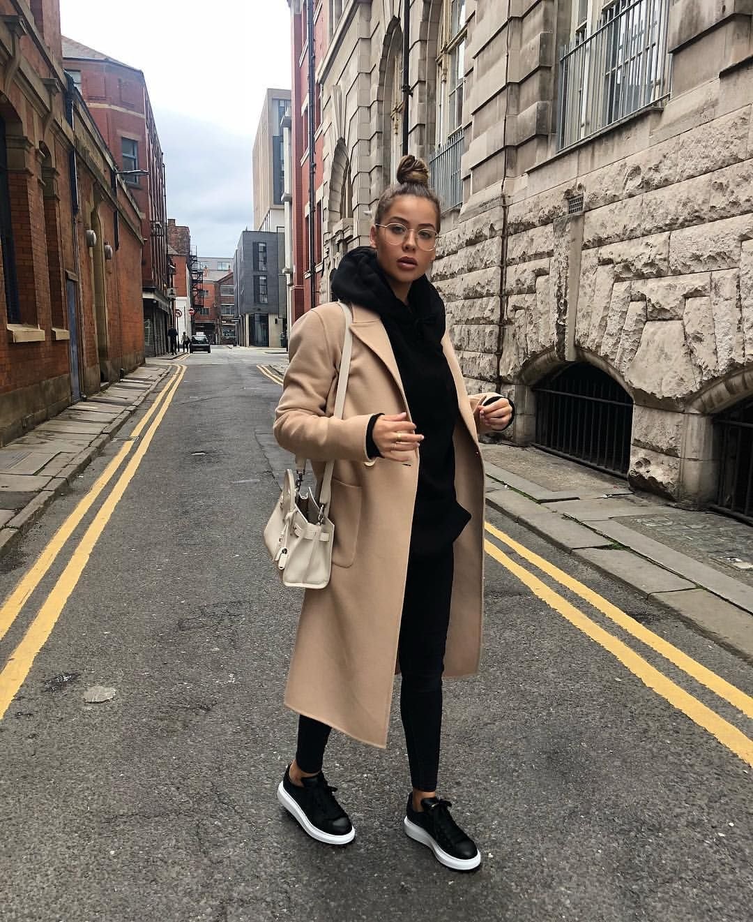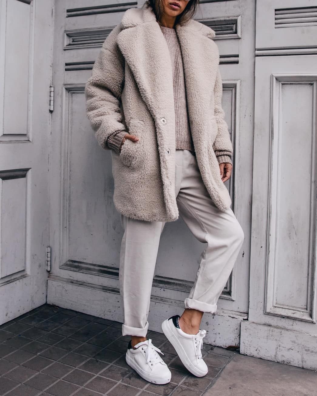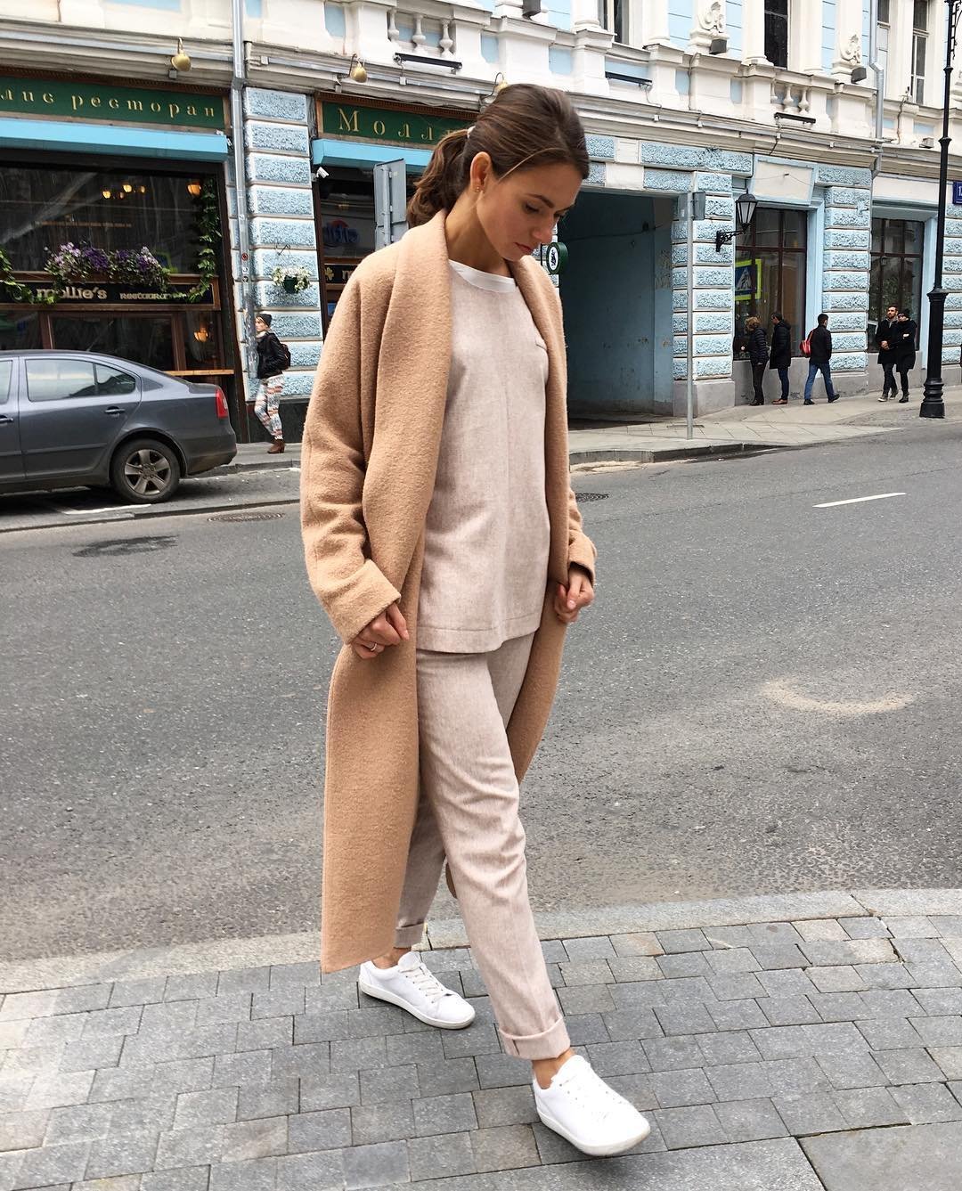 Бежевое пальто и кроссовки
