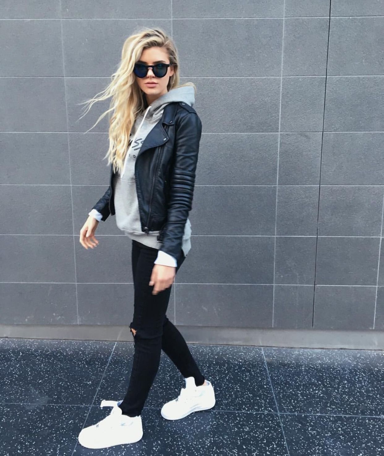 Кожаная куртка и кроссовки женские