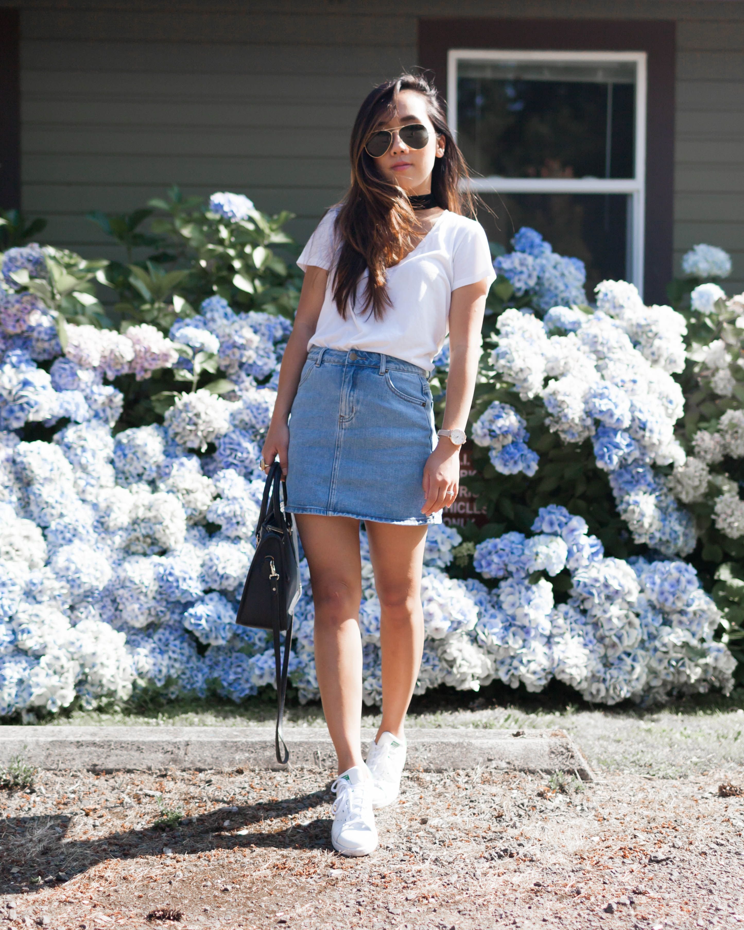 Джинсовая юбка с белой футболкой