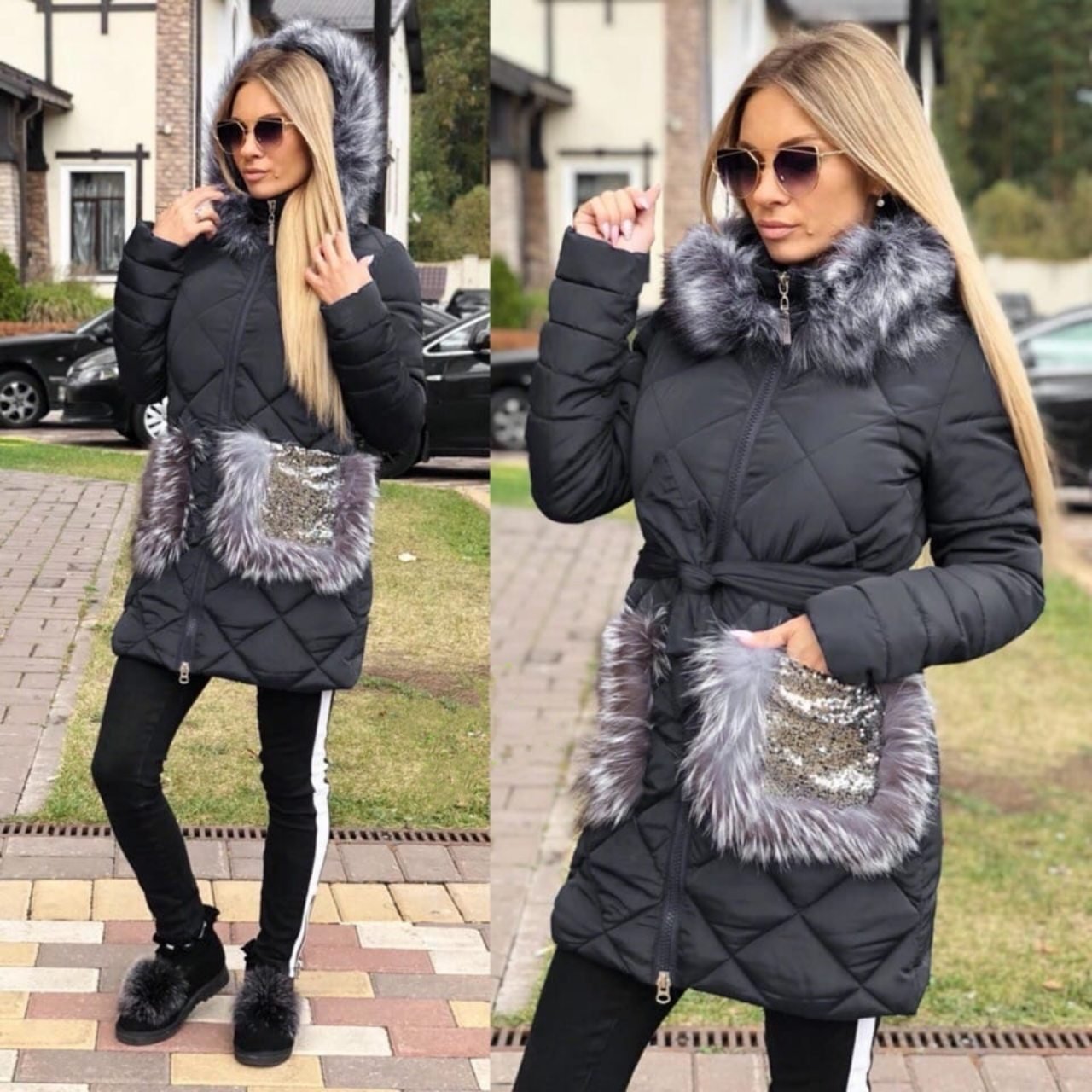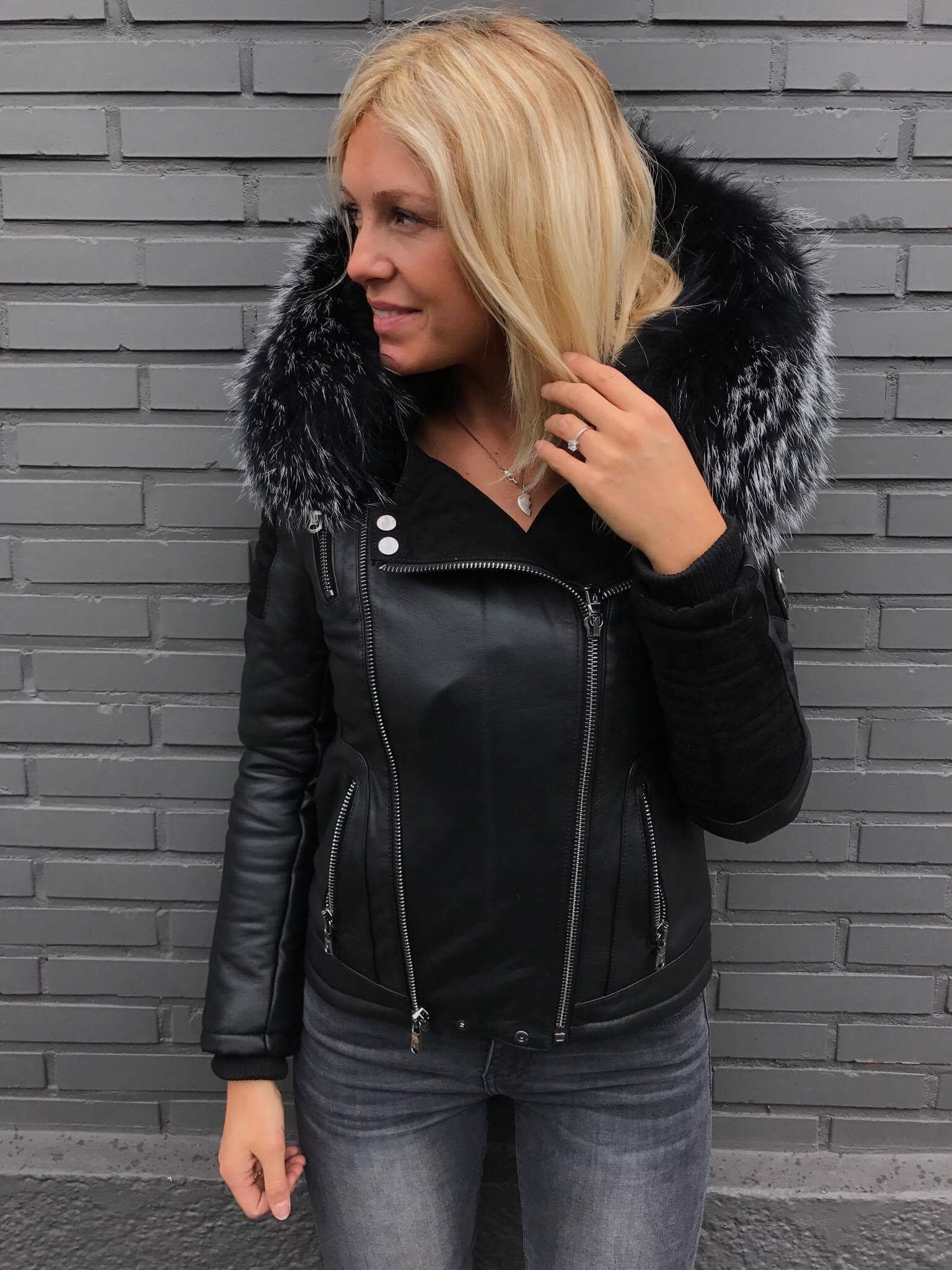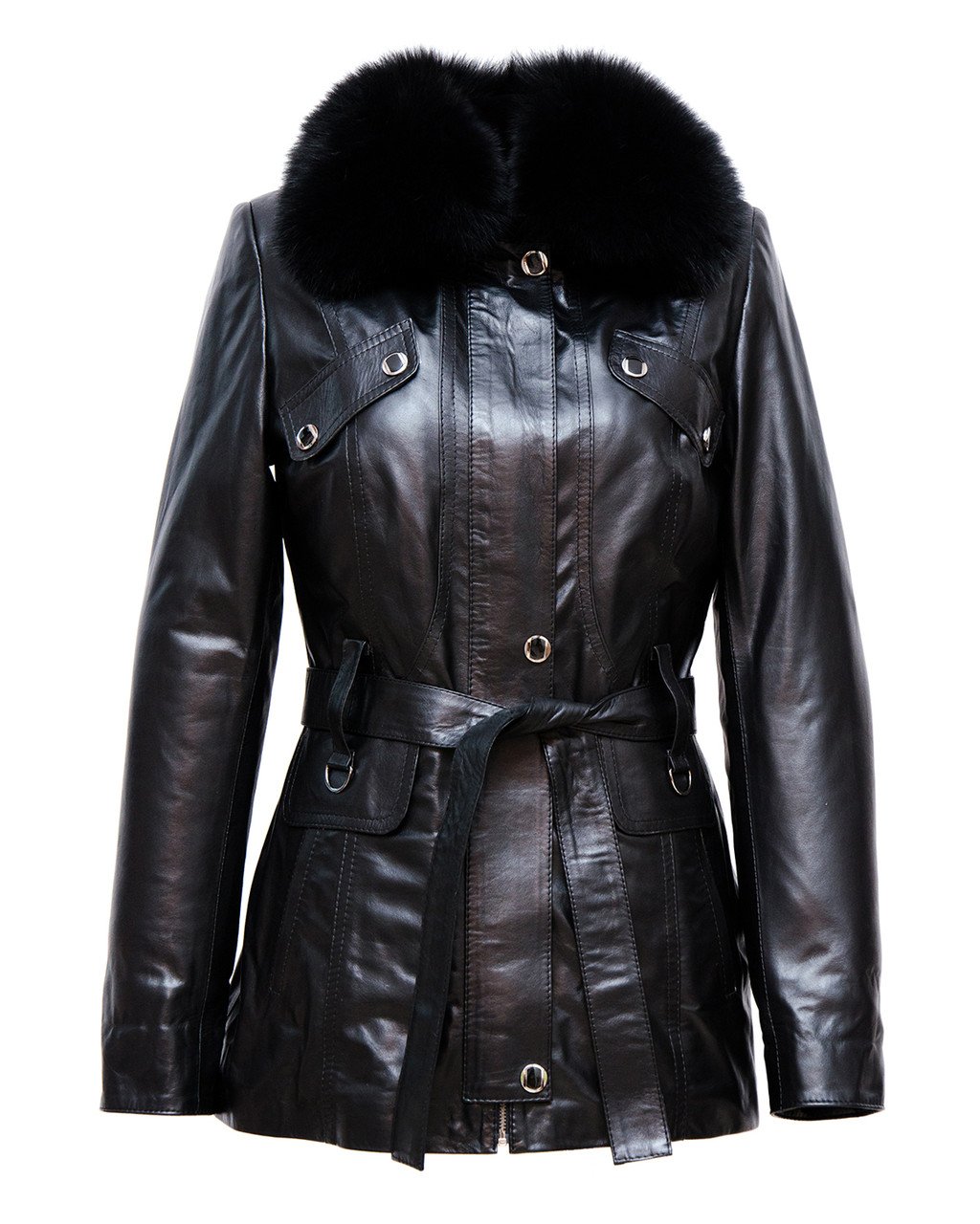 Кожаная куртка до колен с натуральным мехом на капюшоне